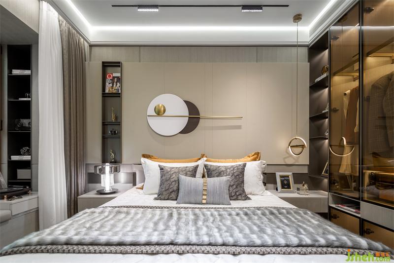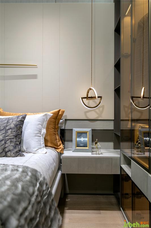 淺色框架的皮革床,搭配極具現(xiàn)代風格的床頭柜,樣板間設計配有作為金屬點綴的臺燈和吊燈,為整個主臥空間增添品質(zhì)感和舒適感。樣板間設計床頭一幅現(xiàn)代線條感的裝飾畫,在淺色豎條紋地毯的映襯下,現(xiàn)代風格的代入感極強。飄窗同時也是男女主人的休閑生活區(qū),音樂唱片,咖啡休閑,周末下午一首歌一杯咖啡,臥室成為男女主人放松休閑的最佳場所,時光在這里顯得格外美好。