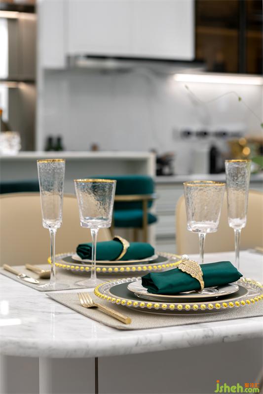 樣板間設(shè)計(jì)客餐廳相連,餐廳的空間較為狹小,所以我們選用了較為簡單且有品質(zhì)感的餐桌與餐椅。每一個(gè)陽光明媚的下午,與家人享用著中西餐的美妙幸福時(shí)刻,新鮮美味的香氣環(huán)繞著餐廳和廚房空間,這就是家的味道。