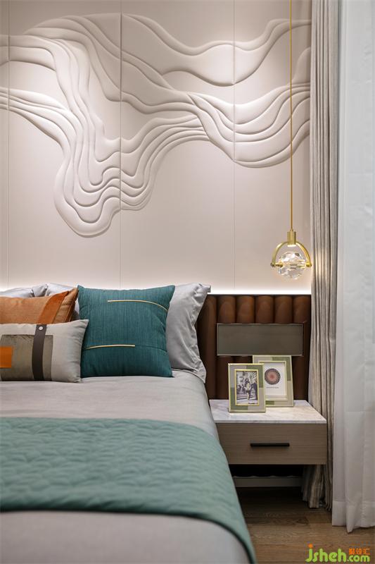 臥室是高雅的藝術(shù)場,承載著空間的情緒性表達(dá)。樣板間設(shè)計(jì)高品質(zhì)且具有設(shè)計(jì)感的床和床頭柜,邊柜墻面放置較為抽象藝術(shù)感的掛飾,以一扇窗打通室內(nèi)外的聯(lián)動(dòng)。