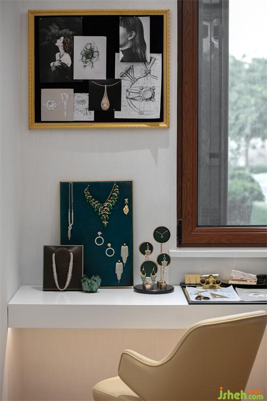 女主人是一名珠寶設(shè)計(jì)師,書房以人物的特性來進(jìn)行軟裝塑造,設(shè)計(jì)珠寶的手稿、珠寶成品展示、珠寶書籍等都是體現(xiàn)女主人的職業(yè)特性,同時(shí)也體現(xiàn)了女主人對(duì)生活高品質(zhì)的追求,以及潮流時(shí)尚的生活態(tài)度。