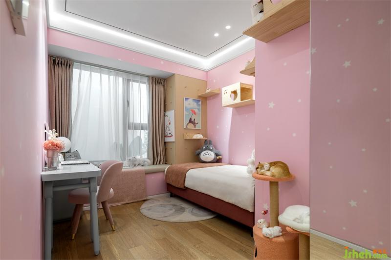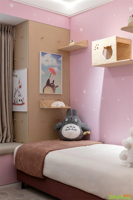 兒童房以“龍貓”為主題,我們選用龍貓壁紙以及墻面貓窩的活動(dòng)線,營造一個(gè)想象力馳騁、輕松活潑的兒童空間。