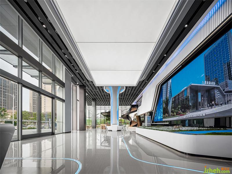 進(jìn)入一層空間主入口處,一個(gè)10米長(zhǎng)的LED影幕及沙盤體塊作為區(qū)塊營(yíng)銷展示,并在整個(gè)前臺(tái)背景墻鋪滿了亞克力發(fā)光模組,讓光線本身成為主角而不是媒介。充滿未來科技感的視覺呈現(xiàn)使得觀者的空間感知概念變得明朗;天花大面積的亞克力發(fā)光模組,通過空間的延伸營(yíng)造出停留在宇宙中的空間站氛圍感。