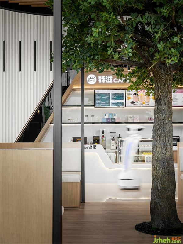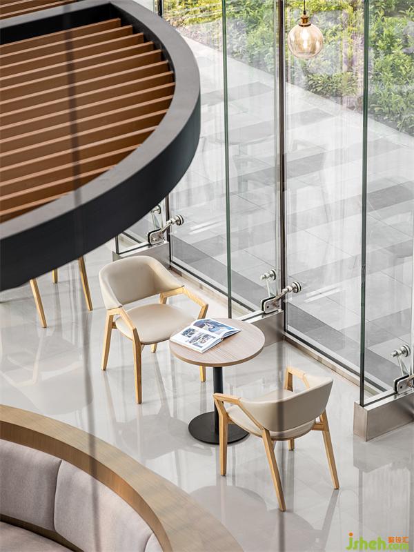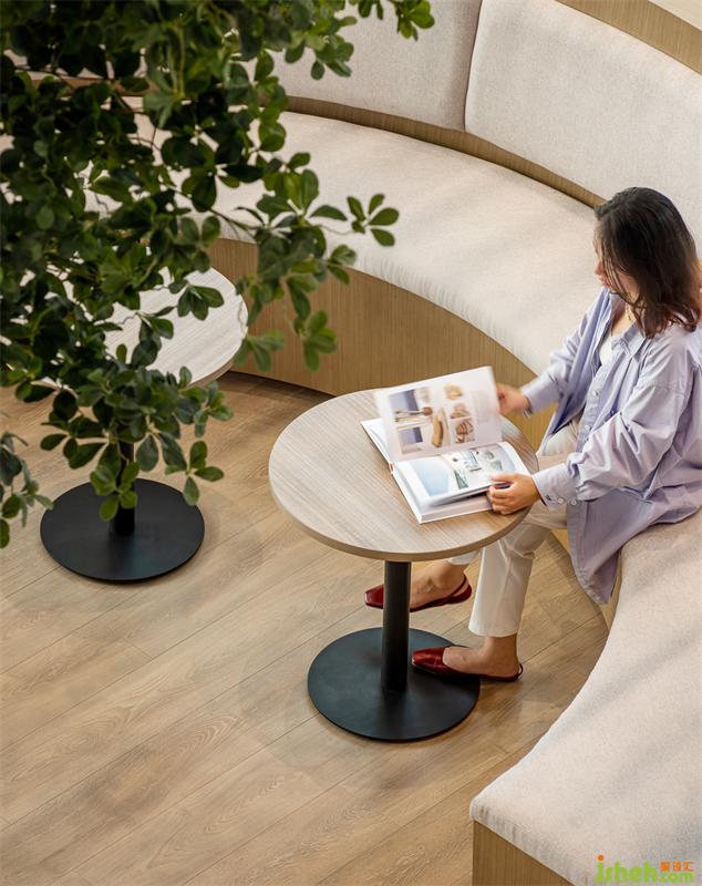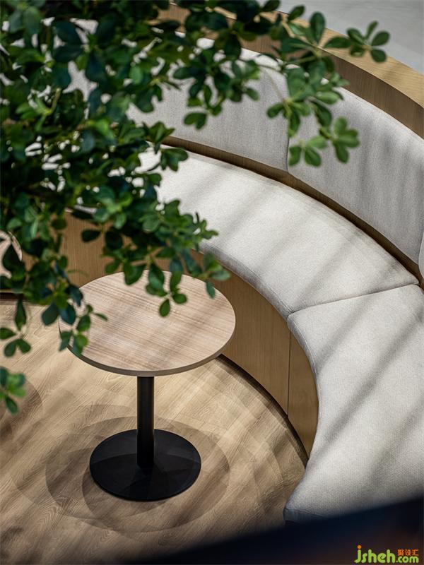 盒子的框架以原木色為基礎(chǔ)色調(diào),這里設(shè)有不同的座位區(qū),獨(dú)立而又自由。大面積的木作傳達(dá)出親近感,與科技感的造型墻面形成豐富的肌理層次,同時(shí)弧形書柜及休閑卡座作為過渡空間,通過中心植物使得辦公環(huán)境更加輕松,豐富了空間的視覺感受。
