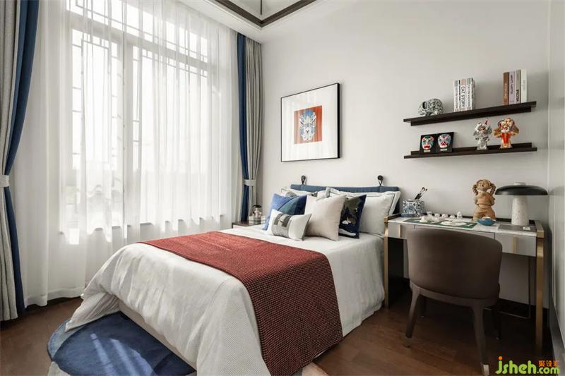兒童房采用瓷器主題營造一個具有中國文化特色的兒童空間,同樣也是一種中國傳統(tǒng)文化的傳播與傳承。藍(lán)色與紅色的沖突對撞、刻意規(guī)避傳統(tǒng)空間單一化表達(dá)的乏味,陶瓷、臉譜與擺件的置入,趣意盎然,摹刻出情景感十足的畫面。