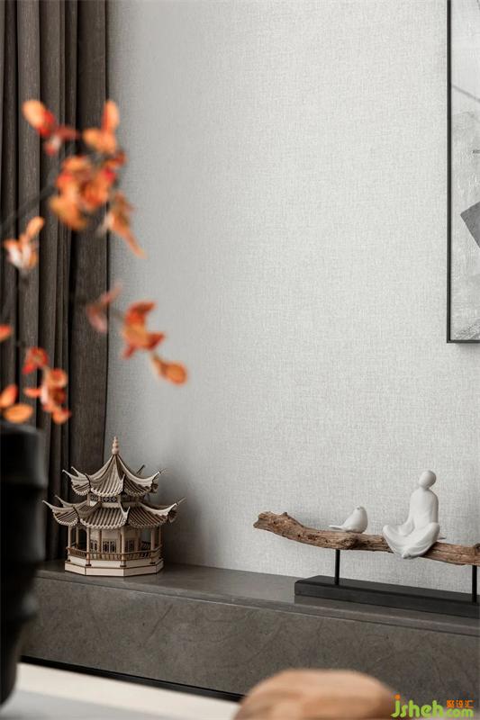 客廳空間秉持“內放”的克制,構建高低錯落的秩序印象。銀杏畫作屏,燈明影搖;人影投射于銀杏畫之上,似穿越了時空長河,得覓“禪”之悠悠。