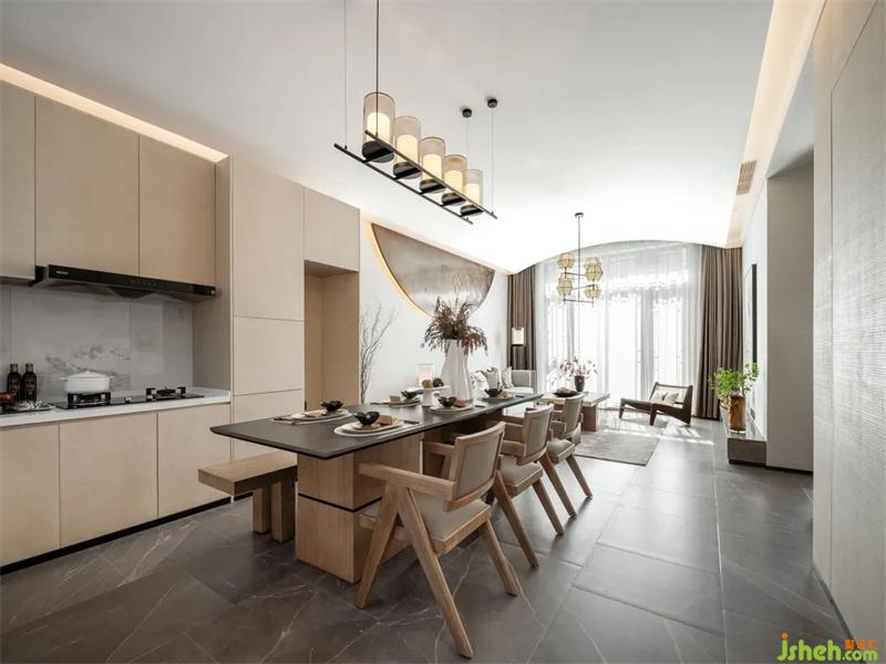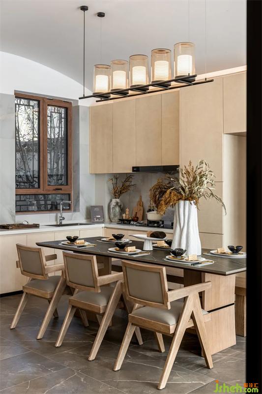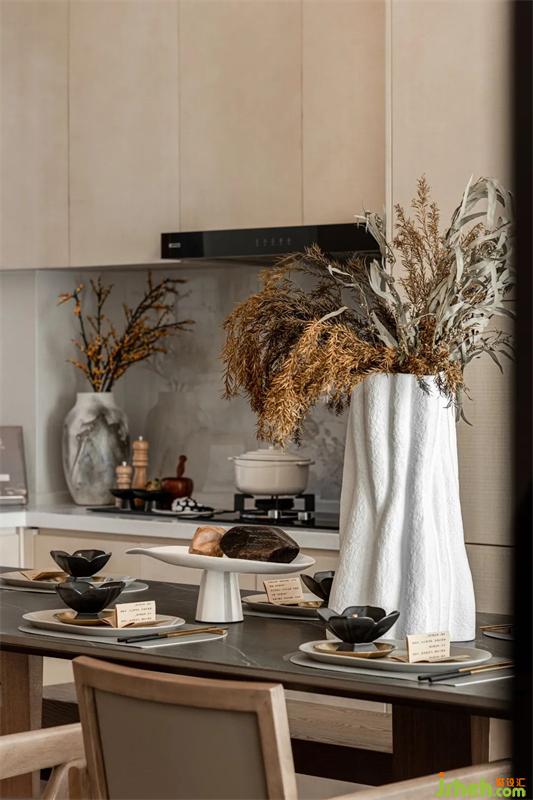 消弭餐廳與廚房區(qū)域的明確界限,我們借用長條吊燈的懸浮、穿插,使之成為一個有靈機的整體。素白的陶土與斑駁的木料,平整的墻面與粗獷的石頭,我們運用材質表達反差感,在空間中呈現(xiàn)不同層次的紋路與肌理。