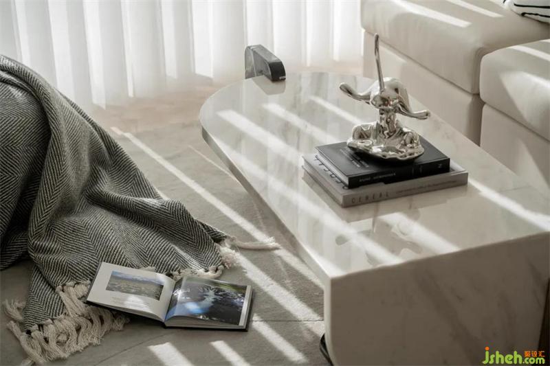 溫潤平滑的大理石茶幾,樣板間設(shè)計造型獨特的凳子與黃色波點蘋果擺件打破空間的常規(guī),調(diào)適安然的色調(diào),凸顯出舒適與自由,沉穩(wěn)又不失自然靈動。主人公在客廳空間里,無論是溫茶咖啡細(xì)品的悠閑自得,還是游戲追劇粗獷的閑情逸趣,都是舒適的放松體驗。