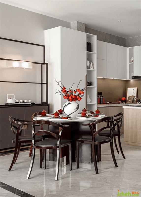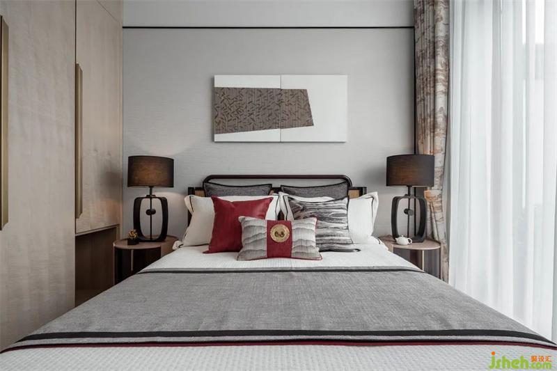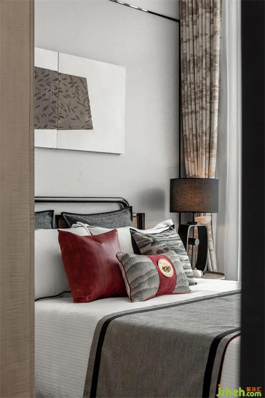 文人雅士的核心審美特點(diǎn)是“雅趣”,“雅”作為一種審美標(biāo)準(zhǔn)和設(shè)計(jì)思想貫穿于明代家具設(shè)計(jì)之中。家具線條直與圓弧結(jié)合,也是文人的傲骨之氣與婉約之風(fēng)的體現(xiàn)。主臥配色清雋風(fēng)雅,溫和的白與灰中庸地包容空間內(nèi)每一個(gè)細(xì)節(jié)。一簇?zé)艋?,一簾光影,深淺不一的紅點(diǎn)綴在空間各處,樣板間設(shè)計(jì)盡顯明代的古意與詩(shī)韻。