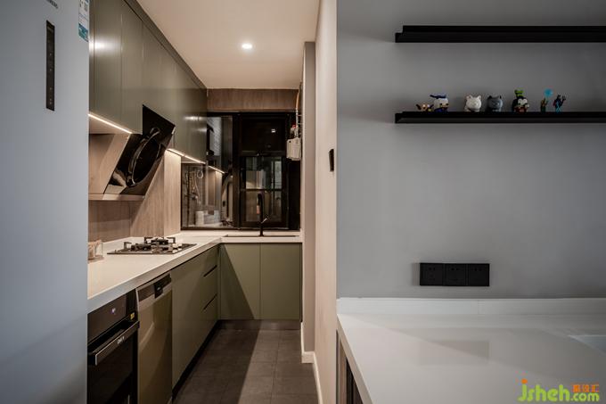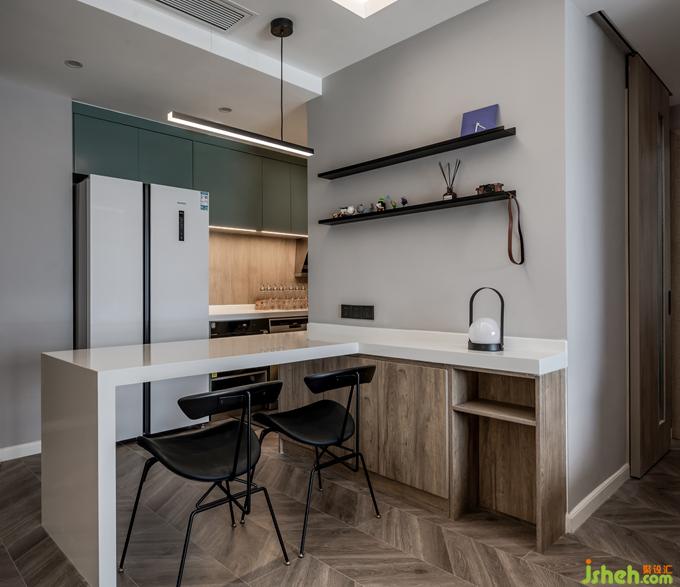 客廳的布置簡單干凈,暖灰色墻體搭配原木色電視柜,室內(nèi)設(shè)計師一組沙發(fā)+橢圓茶幾,日常坐在地毯上,靠著沙發(fā)看劇,擼貓,或在茶幾上進(jìn)食,一個人的生活,便能如此隨性自由。電視柜的設(shè)計增加了客廳的儲物功能,拉平了客餐廳墻體,從客廳看室內(nèi)過道,將公共空間連成一體,相互呼應(yīng),擴(kuò)大空間視覺感。