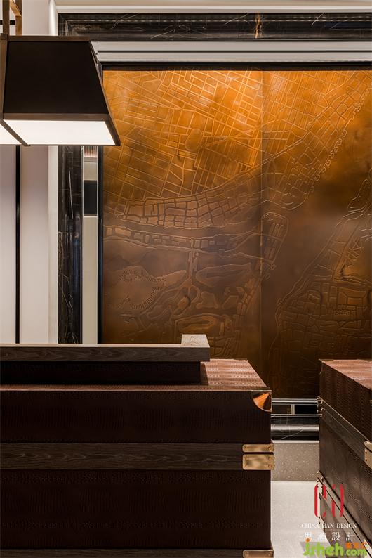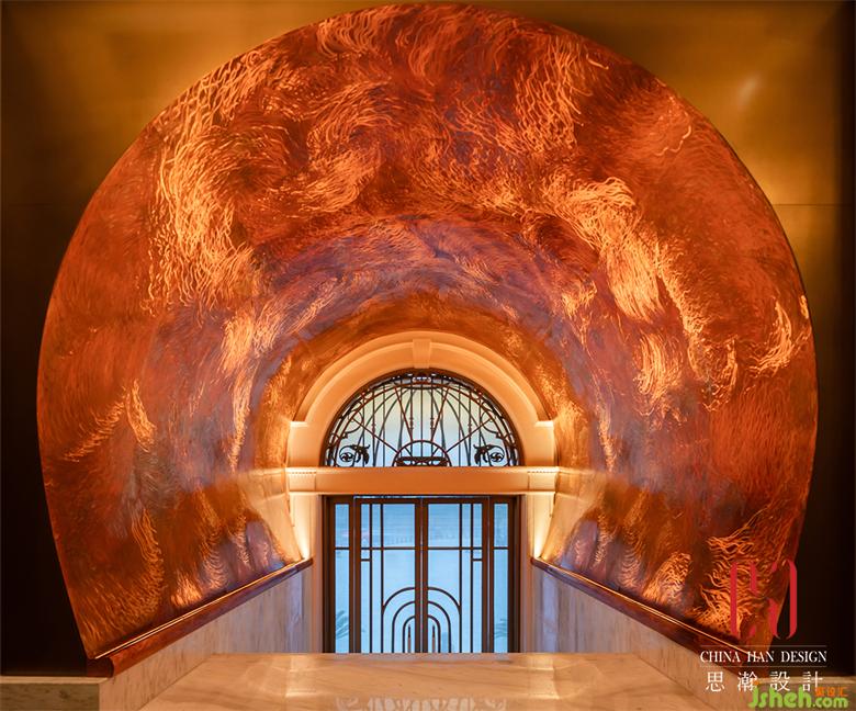 金光燦爛的黃銅表皮花紋肌理打磨制作的奢侈,抓住了人們的視線。經(jīng)過各項考慮上選擇重金屬類的黃銅板詮釋,黃銅結合手工藝去做拋面,并以大曲面的方式讓銅面不只是一般的金面,更有紋理與肌理,在墻面上更注重細節(jié)不做多余的焊接,在光線與銅面反射下,空間彷佛也是雕塑品。