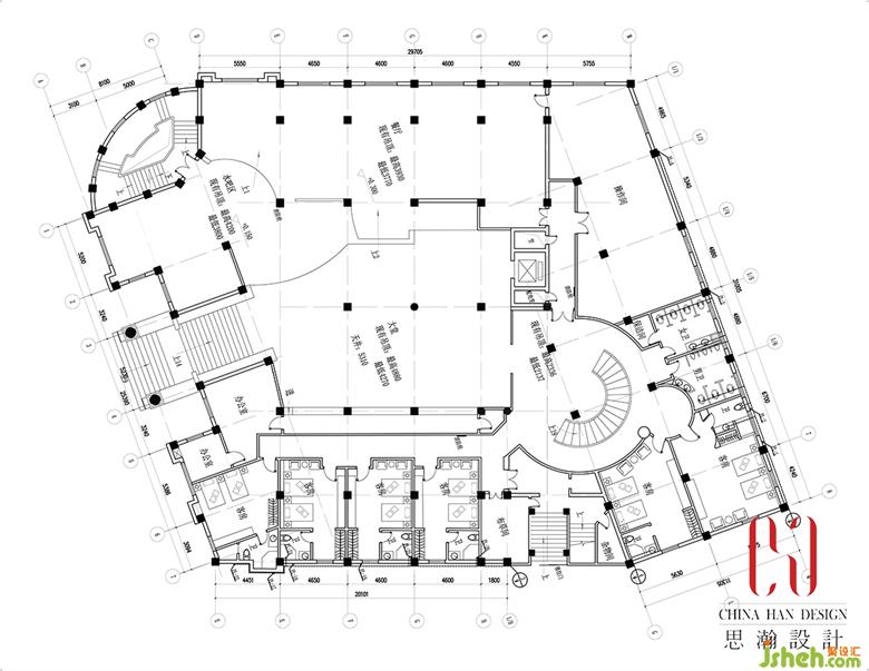針對原建筑中的6根立柱,設計師借用墻體進行了包裹處理,只保留了將視線導向前臺的2根立柱。