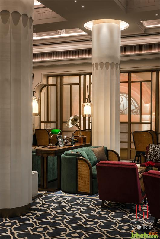 自由圍合的沙發(fā)和藤椅,國際酒店設(shè)計配合明度和飽和度偏低的紅色、綠色靠墊以及各種窗楞格紋的地毯,搭配充滿宮燈、老照片、將軍罐、唱片機等充滿城市記憶的物件,民國風(fēng)情撲面而來。