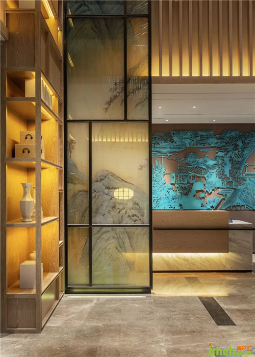 酒店大堂延續(xù)外立面的建筑元素,酒店設(shè)計(jì)將四合院的屋頂形態(tài)藝術(shù)化的表達(dá),運(yùn)用現(xiàn)代的琉璃材質(zhì),塑造現(xiàn)代的時(shí)尚與輕奢感。墻面自然元素的屏風(fēng)與木格柵,營(yíng)造現(xiàn)代簡(jiǎn)潔的和諧之美。