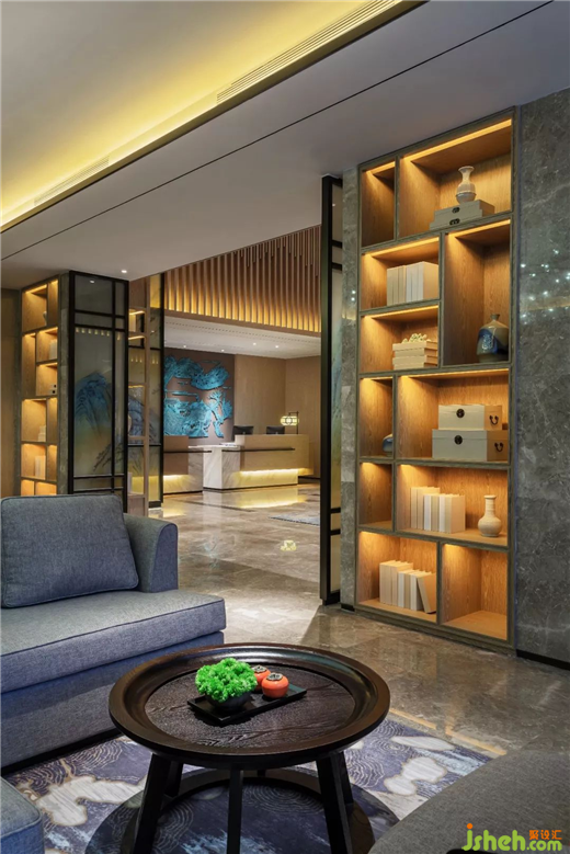 定瓷作為宋代五大名窯之一,酒店設(shè)計(jì)師以軟裝陳設(shè)的方式,融入空間柜架中,將傳統(tǒng)建筑、自然、藝術(shù)品相融合,營(yíng)造出自然、輕雅的城市人文驛站。