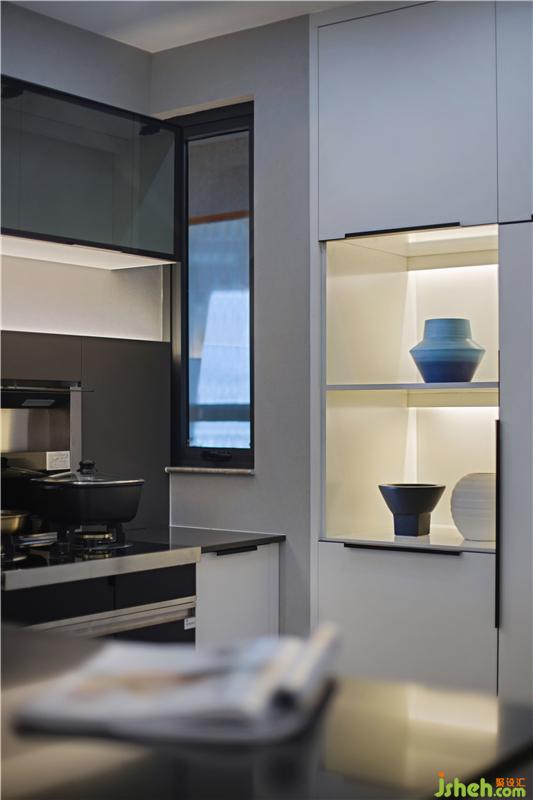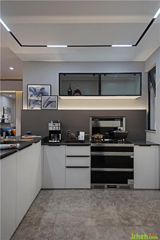 餐、廚、客一體式的開(kāi)放式廚房,增加社交屬性,同時(shí)簡(jiǎn)化了廚房到餐桌的動(dòng)線,節(jié)約時(shí)間。整體家具風(fēng)格高度統(tǒng)一,確?!伴_(kāi)放式廚房”能自然地融入到整體家居氛圍中。