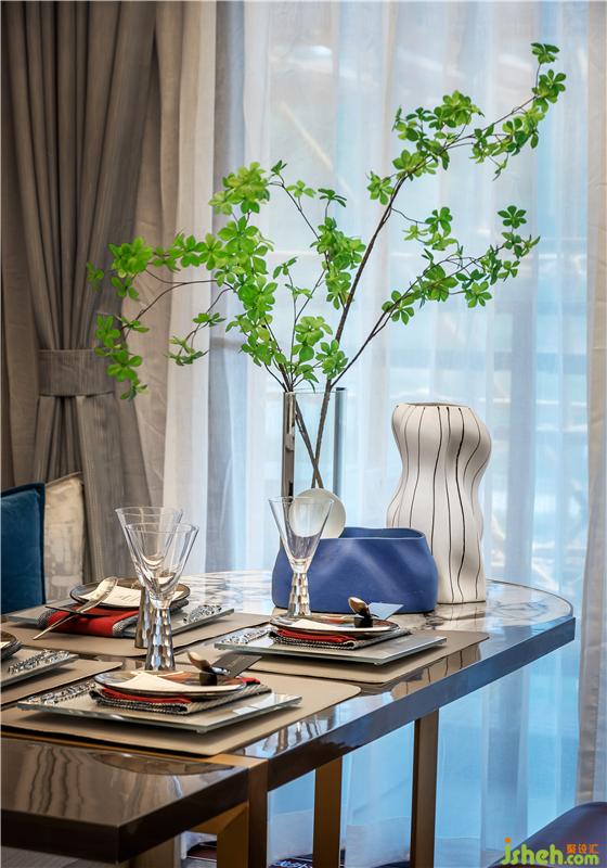 客廳功能集休閑、會(huì)客、娛樂等為一體,采用各種材質(zhì)、色彩、形制合奏出獨(dú)特的藝術(shù)氛圍。在色彩上沿用整體硬裝的基調(diào),加入了時(shí)尚紅和群青色,感受來自米蘭的時(shí)尚氣息。