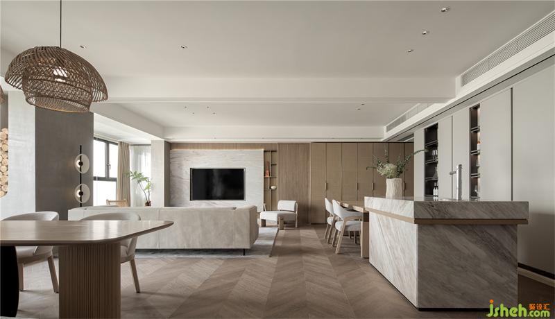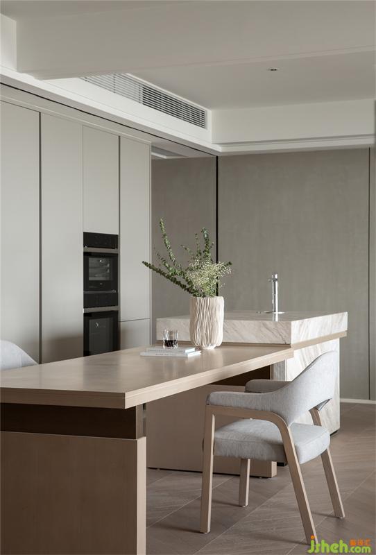 在這個(gè)空間里,原木色餐桌和大理石西廚吧臺(tái)融為一體,干凈線條的家具和空間自然元素碰撞,你會(huì)發(fā)現(xiàn)這是一種非常有趣的結(jié)合,空氣中飄散著回歸自然的舒暢,空間里達(dá)到一種奇妙的平衡。