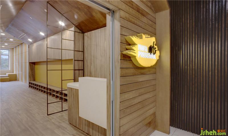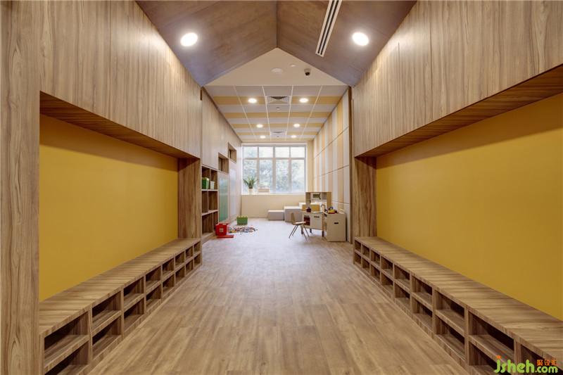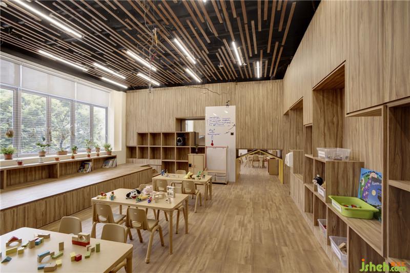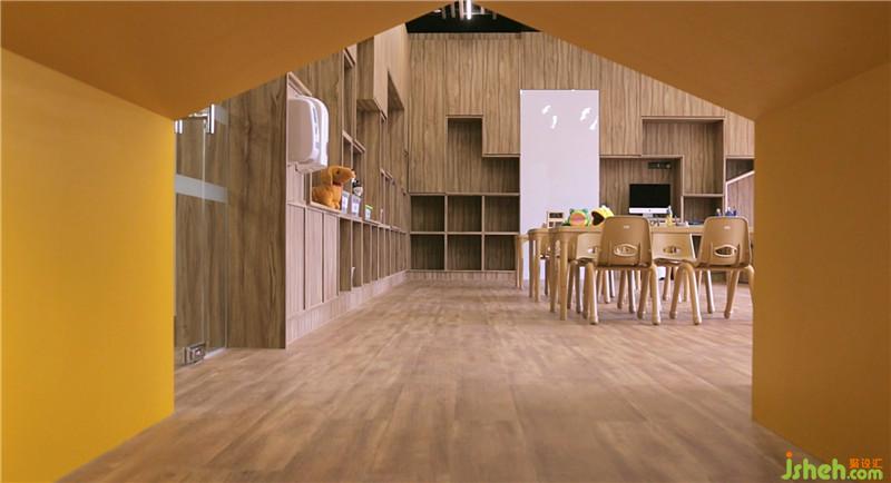 首先,設(shè)計師使用了簡單干凈的木色來作為整個設(shè)計的主要顏色,并用木質(zhì)材料取代瓷磚和涂料。孩子們可以赤腳奔跑在木質(zhì)的地板上,在無形之中向孩子們傳達低碳,綠色環(huán)保的教育理念。室內(nèi)設(shè)計師