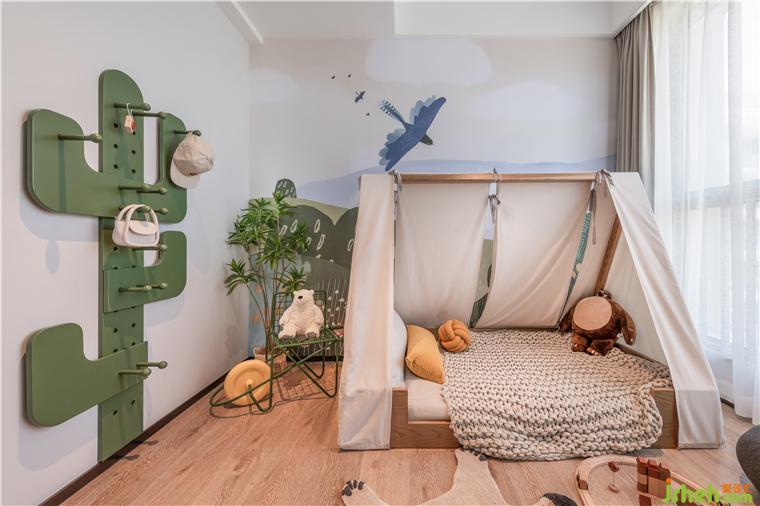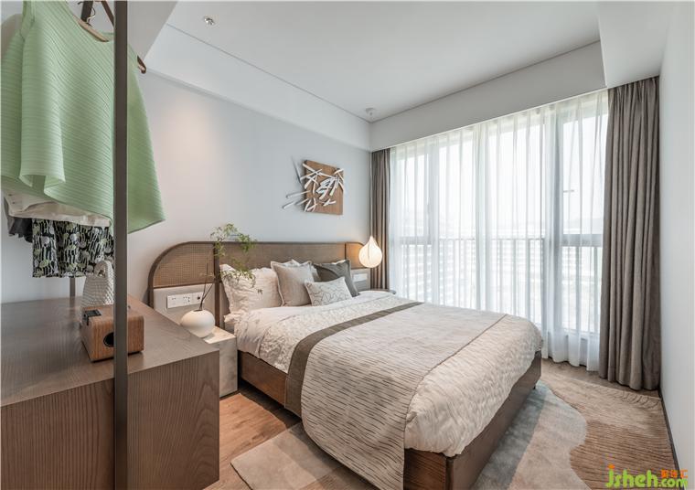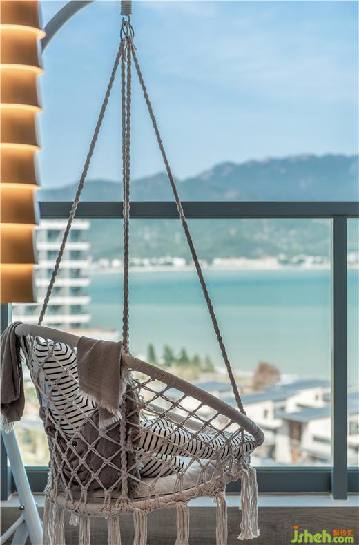 植物元素遍布整個樣板房,窗簾“金葉環(huán)繞”,地毯如陽光下的斑駁樹影,床毯以大鵬七娘山“七仙女”為靈感元素嵌入,酒店公寓設計整體空間將大鵬的傳承過往一一呈現(xiàn)。