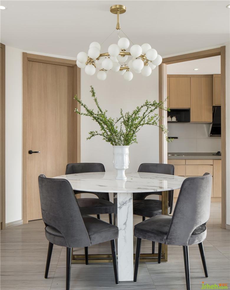 本案在入戶長廊做了大膽的改動,室內(nèi)設(shè)計師將原本的長廊改成圓形的餐廳,餐廳的四周用柜子砌成圓形,這樣的改動首先打破了入戶長形走廊帶來的壓抑感,其次滿足了業(yè)主對圓形餐桌的需求。