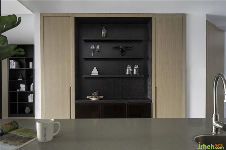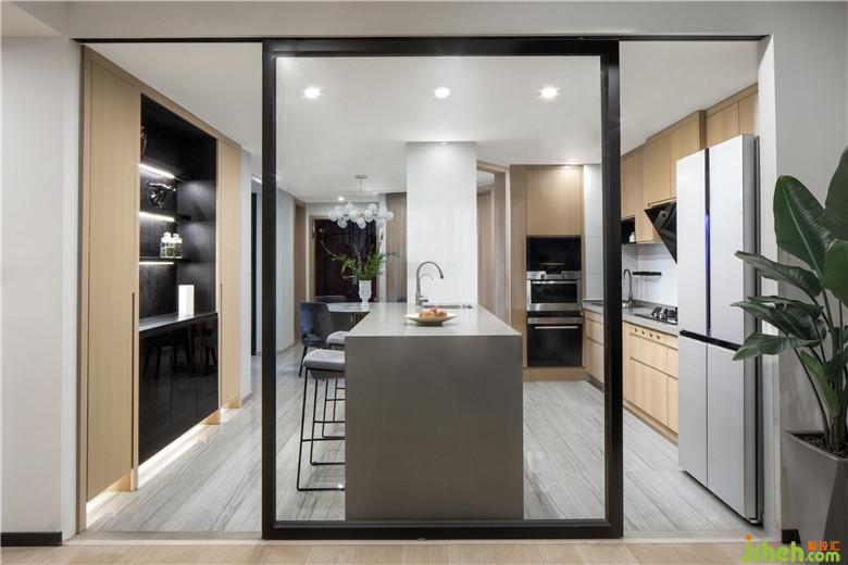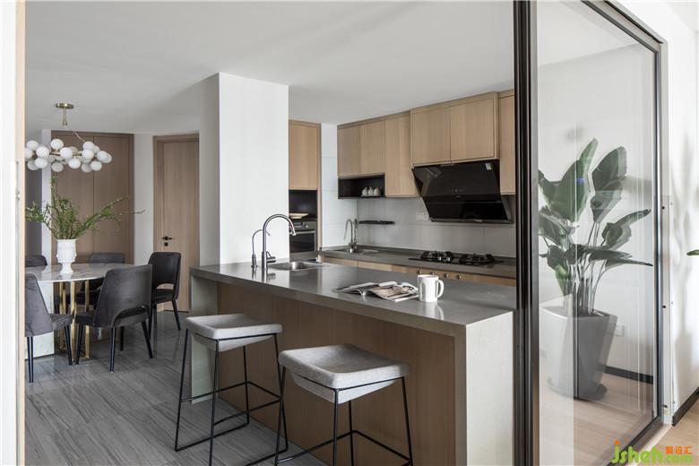廚房和客廳之間設(shè)計玻璃大滑門,室內(nèi)設(shè)計師這樣的設(shè)計首先可以隔絕廚房的油煙其次讓廚房的區(qū)域光線更加的充足明亮在視覺上使空間更加的通透。廚房的吧臺以柱子而建即滿足了業(yè)主對島臺的需求同時也避免了孤立的柱子給空間帶來的尷尬局面。
