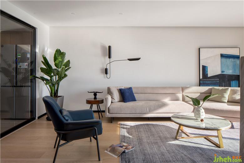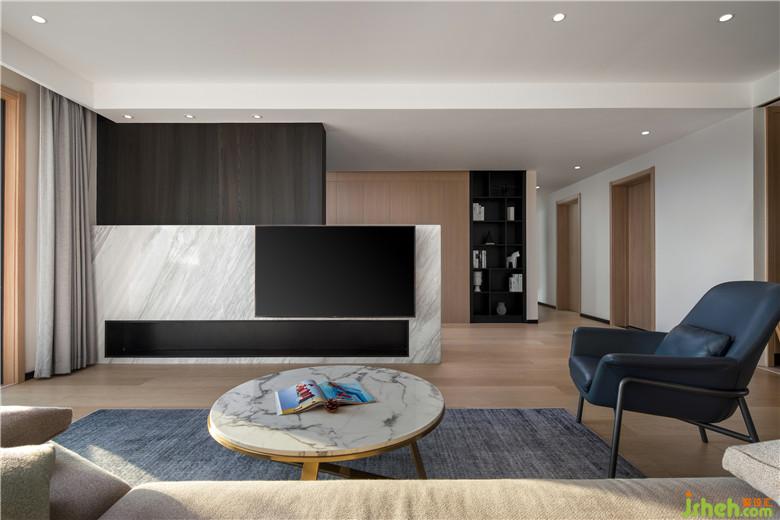 客廳的電視墻做了高低錯落的設(shè)計在立面構(gòu)圖上美觀大方,大理石和木飾面材質(zhì)的綜合運用給視覺帶來了巨大的沖擊力。電視柜的背面是親子空間,坐在大理石電視柜背面的吧臺上即可以照顧孩子也可以跟客廳的人有所的交流,室內(nèi)設(shè)計師這樣的設(shè)計給業(yè)主的生活帶來了極大的便利性。