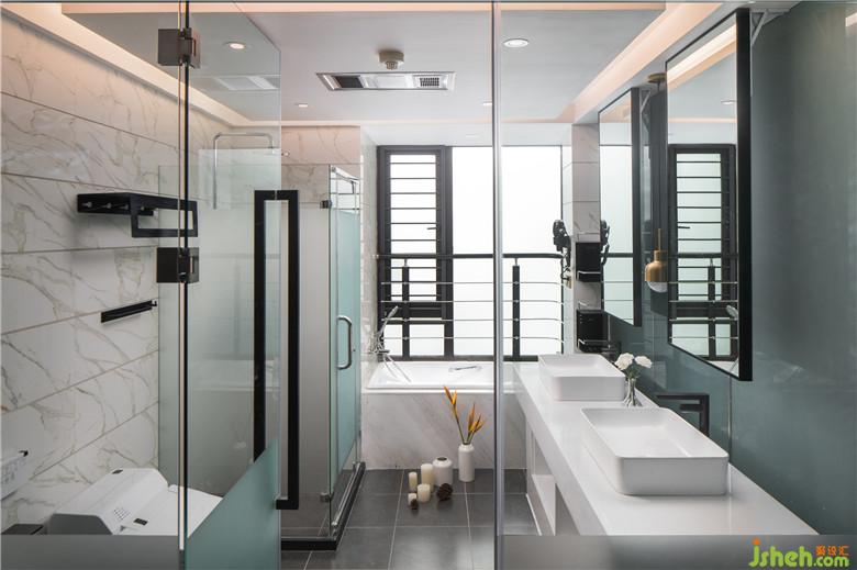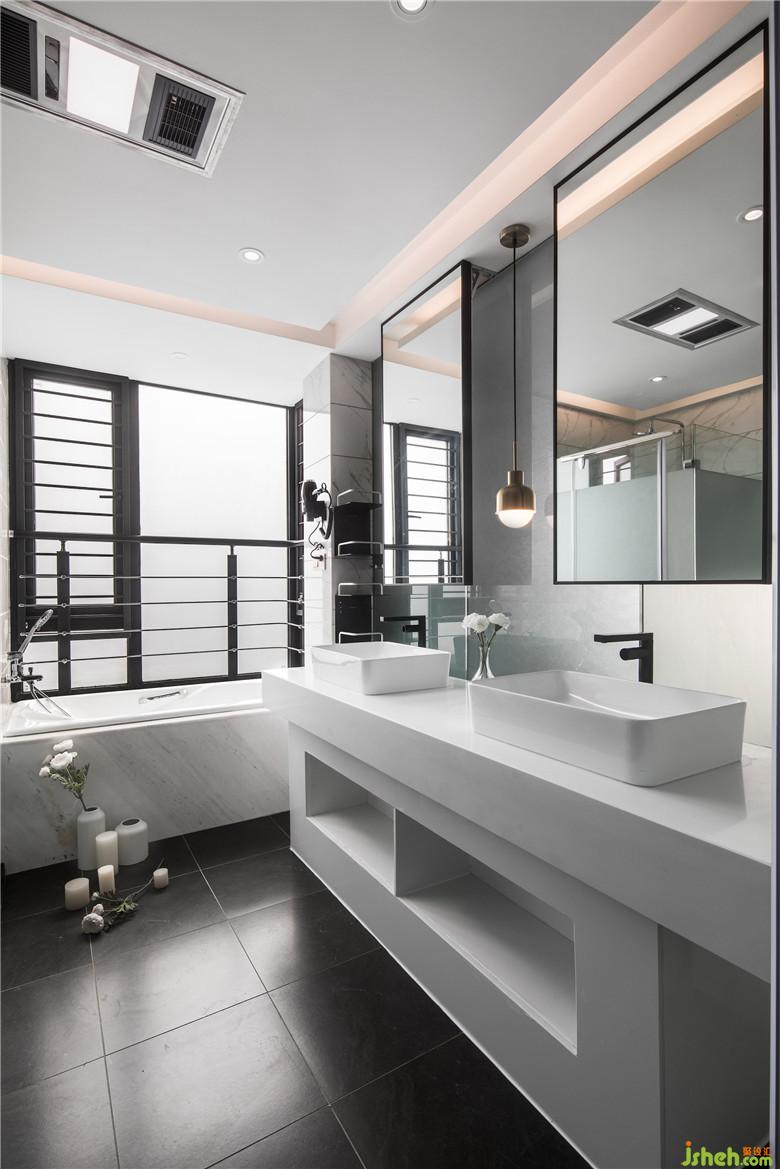 衛(wèi)生間設(shè)計(jì)了雙臺(tái)盆滿足兩個(gè)人同時(shí)使用,浴缸設(shè)在靠窗的位置方便屋主欣賞窗外的江景別有一番趣味。