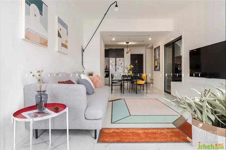 客廳里面小房間的墻體被打掉之后跟客廳連在一起形成公共區(qū)域,增加了客廳的使用面積同時也使客廳的空間更加開闊、明亮??蛷d的墻面以白色為主通過光線的反射來增加空間的采光,軟裝以灰白色作為基調(diào)局部點綴紅色、藍(lán)色以此來活躍空間的氣氛。