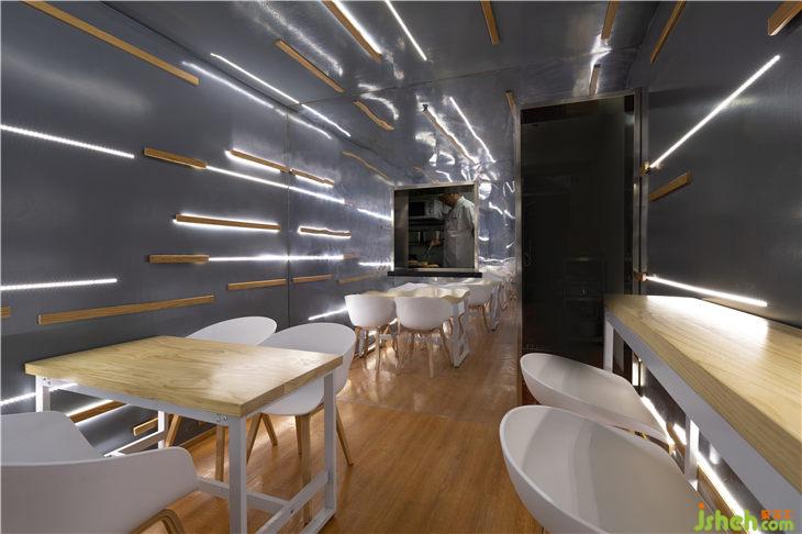 但為滿足較為良好的用餐體驗,并且增加空間的橫向?qū)挾?,使之又不至于太過深邃壓抑。在經(jīng)費有限的條件下,設(shè)計師摒棄使用鏡面材質(zhì)而嘗試用在墻面上涂刷價格較為低廉的環(huán)氧樹脂漆創(chuàng)造反射與發(fā)光感的空間界面,漫反射帶來類似磨砂的質(zhì)感又不至于使光線反射過于強烈而引起不適。同時在柜臺、廚房與就餐空間的分隔面等非墻面界面則使用鏡面亞克力使空間形成一個鏡面反射的整體同時增強空間的縱深感??臻g界面之間的界限模糊,很好地增加了空間的開闊性。