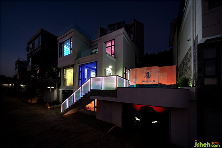 洱海是個(gè)陽(yáng)光極其豐富的地方。如何利用天光與各空間(展陳、居住、休閑等)進(jìn)行互動(dòng)成了我們的第一選擇。不希望有鏡面過(guò)于銳利冷酷的感覺(jué),又希望能隱隱約約之中反射出外界的精彩,打造一種朦朧的效果。陽(yáng)光板成了我們的首選,半透明,光滑,易于操作。在不同空間的天花與墻面置入半透明的陽(yáng)光板,并在陽(yáng)光板后面置入多彩的LED燈光,通過(guò)最簡(jiǎn)單的色彩透過(guò)陽(yáng)光板,與白墻形成對(duì)比與互動(dòng)。從入口走道的頂面,到貫穿整個(gè)空間進(jìn)深的墻面,陽(yáng)光板發(fā)光面直接以完成面的形式出現(xiàn),在房間里,陽(yáng)光板天花也一定程度上轉(zhuǎn)變成了空間擺件的屬性。而不同維度上的折射、反射疊加,在感官上放大了空間各方向的尺度,從而改變了使用者的空間感受。