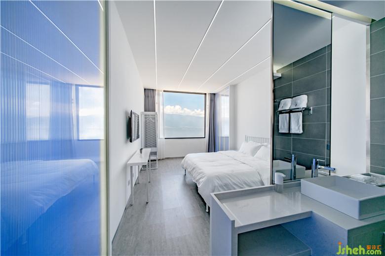 作為項(xiàng)目主體的浪漫自有其約定俗成的環(huán)境氛圍,朦朧感及變幻的光影即是浪漫的環(huán)境所需要的屬性。房間內(nèi)的核心回歸到更為常規(guī)的床與相關(guān)的居住功能,外界的朦朧以及空間的壓縮正是伴侶間所需的情欲催化。獨(dú)立設(shè)置的家庭影院則營(yíng)造了不受打擾的電影約會(huì)體驗(yàn)。浪漫的洱海,朦朧的光線,神秘的色彩,創(chuàng)造出一個(gè)獨(dú)屬二人的神秘環(huán)境。床,置物架與長(zhǎng)桌在整個(gè)空間中形成互動(dòng),在燈光下仿佛一切都在低聲耳語,訴盡伴侶間的情絲。