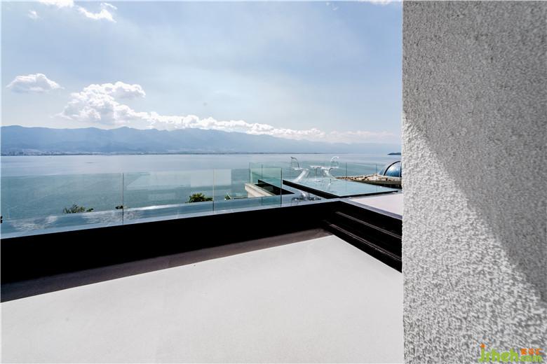 屋頂露臺(tái)主要為拍攝所用及享用下午茶的絕妙之處。遠(yuǎn)處的洱海在玻璃的反射下,天光湖水共一色,人仿佛懸在空中,享受人間這一灣清澈的湖水。整個(gè)臺(tái)面只在中間區(qū)域做了鏡面,而沿露臺(tái)有完整的一道水面去反射天光,深黑的池底與水面形成的反射,同鏡面形成的反射有著微妙的差異,鏡面,水面,洱海與天空,四個(gè)不同的景色同時(shí)起舞形成特別的休閑環(huán)境。