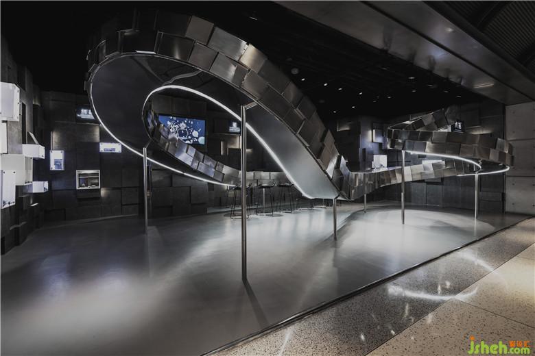 深灰色的幽暗背景,銀色的鉆石紐帶在空間中飛舞旋轉(zhuǎn),顧客自然的被紐帶所吸引著,進(jìn)入展陳空間,欣賞美好的珠寶設(shè)計(jì)作品。紐帶在不同高度自然的形成引入的拱門,平滑的展柜,舒適的顧客服務(wù)區(qū),以及最耀眼的螺旋塔冠。