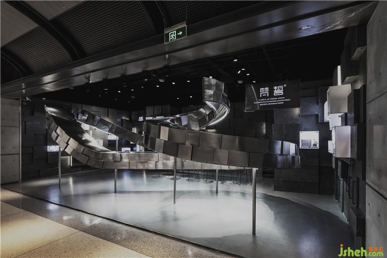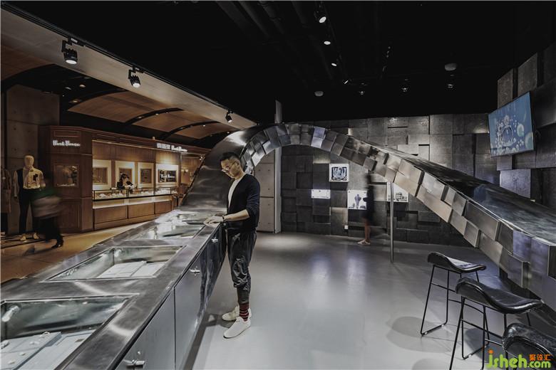 誠(chéng)品中大多店面以白色為主,木色搭配,相對(duì)空間比較均質(zhì),缺乏關(guān)注點(diǎn)。本案的顏色、造型都大大區(qū)別于別的店面,并結(jié)合業(yè)態(tài)之后重新闡述新的空間效果。整個(gè)空間被深灰色石材包裹著,一條銀色紐帶在空中飛舞,如同一個(gè)深黑色珠寶盒中散發(fā)異彩的鉆戒,從形式上隱喻項(xiàng)目主題。