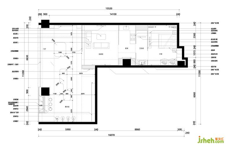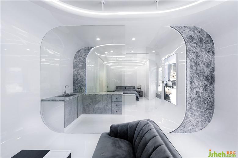 由于空間面積有限且平面本身形狀較為特殊,依照傳統(tǒng)家居體驗館模擬真實家居環(huán)境的模式極易造成功能分布混亂且尺度失調。其次,考慮到體驗者各自的家庭內飾風格、個性、審美特質等等均存在差異性,嘗試模擬真實環(huán)境的設計反而容易適得其反,產生陌生疏離感。因此,布局上將單個家居場景與線性的體驗流線相結合,按照私密性由弱到強的順序,依次從外而內布置客廳、廚房、洗手間、臥室,使顧客得以在場景模塊間“穿梭”,不同場景中的各個產品的特性、優(yōu)勢及使用方法也隨之得到理性且明確的傳達。