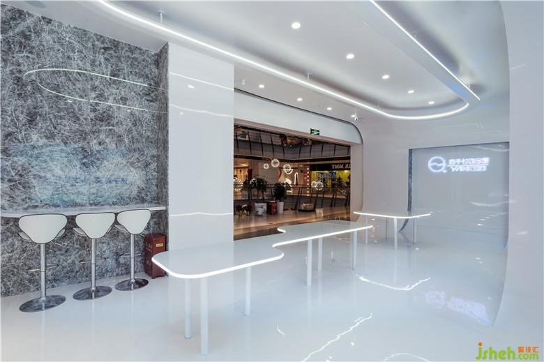 吧臺洽談區(qū)主要針對購買意向較強顧客,用于顧客與店員深入交流產品信息及購買意向。吧臺置于平面一角,借助櫥窗的遮擋,在店內創(chuàng)造了一處相對私密的空間。