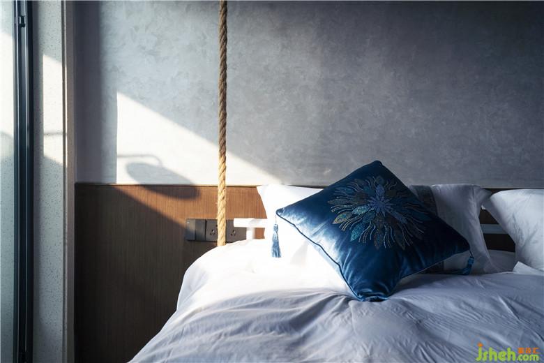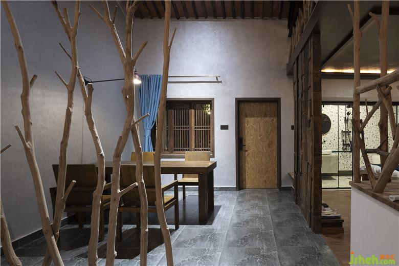 材料與鄉(xiāng)野元素運(yùn)用:入戶秋千、繩垂掛下的沙發(fā)吊床是心歸田園的悸動(dòng);質(zhì)感斑駁的淺灰色藝術(shù)墻漆結(jié)合古樸的老榆木裝飾,餐桌區(qū)頂部紗幔自木架懸掛來,整體透出如置身鄉(xiāng)間的野趣,飄渺悠閑,古樸靜謐。用樸素的材料組合打造出了素雅且極具辨識(shí)度空間。酒店設(shè)計(jì)