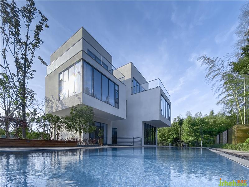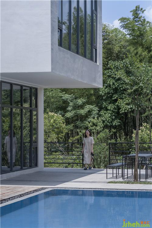 建筑通體呈現(xiàn)簡約的白色,通過方盒子的穿插組合、形體上的退讓或出挑,不僅豐富空間類型,獲得更多能夠親近自然的灰空間,又能保持整體純粹的建筑形式。最終讓建筑既融入在這片綠意盎然,又引人注目:建筑、遠山、竹林、流水共同構(gòu)建出了現(xiàn)代人所向往的詩意棲居生活,樸素、自然、閑適。民宿設計