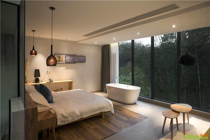 在二、三層的客房,設計師根據(jù)每間客房所處方位與周邊自然條件,采用了朝向不同景觀的大面積轉(zhuǎn)角落地窗。民宿設計