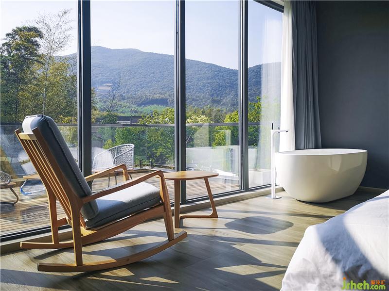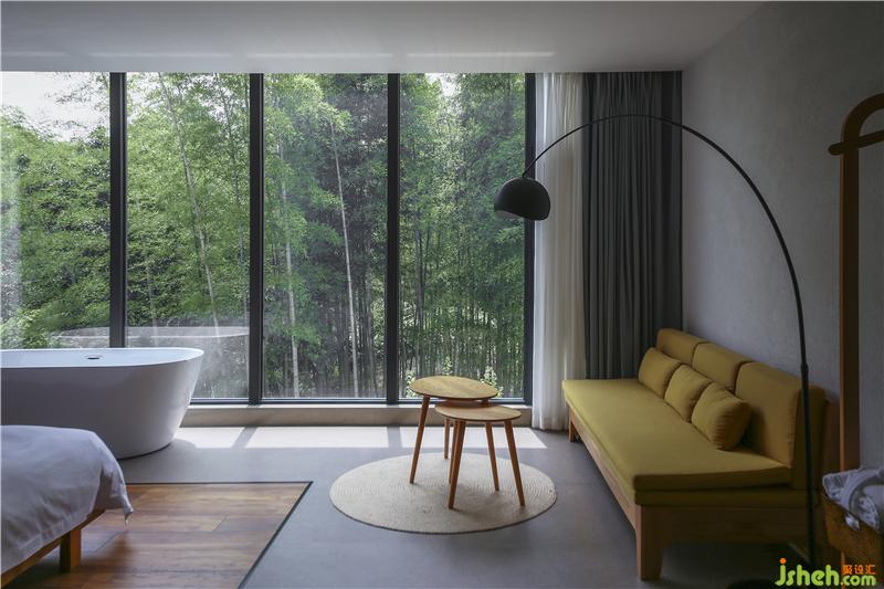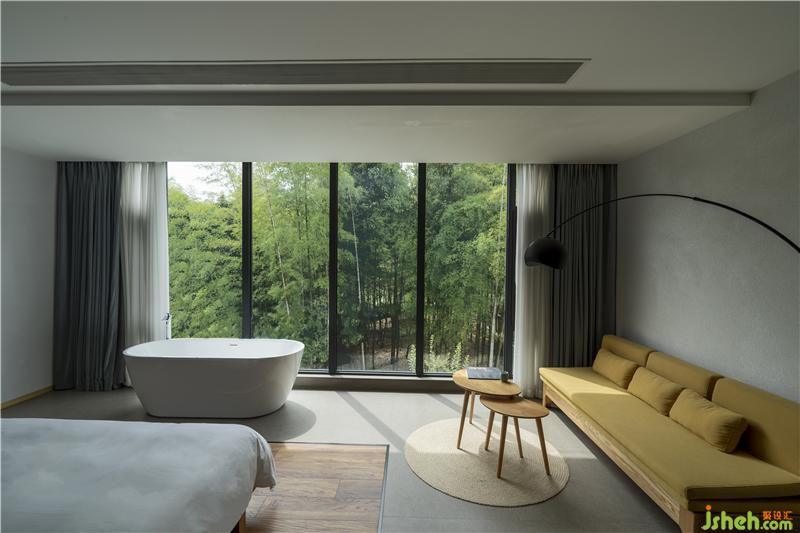 同時,每間客房的主題與其觀賞到的不同景觀(溪澗、遠山、茂密的竹林等)呼應,這將不同的自然景觀如同畫卷一般完整地在住客眼前展開,建筑內(nèi)部實現(xiàn)了對自然景色最大化的吸納,“探溪”“沐陽”“搖竹”等別致的房間名也由此得來。