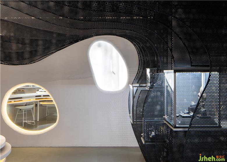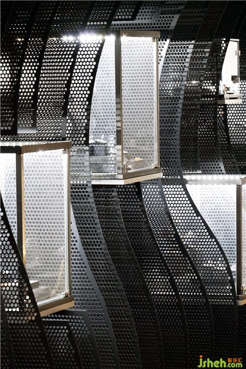 展柜創(chuàng)新地將藝術(shù)展示和零售兩種功能融合在一起,珠寶店鋪設(shè)計(jì)展現(xiàn)了品牌特色并具有藝術(shù)性。飾品在深灰色盒子的映襯下如同寶石般發(fā)出耀眼奪目的光。