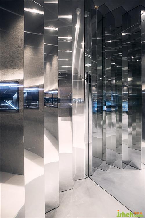 鏡面棱柱前,看著反射出的無數(shù)的自己,陷入平行時空之間與自我的相互對話,無數(shù)個平行時空是否也存在著無數(shù)個正在進行卻無解的閉環(huán)?是否匯集著你無數(shù)個選擇造就的千差萬別卻可能殊途同歸的人生?自由的時空和記憶,將過去、現(xiàn)在、和未來交織在一起,編織著過去與未來的組曲。鏡面棱柱依次排列,鏡像空間放大了視覺感官,同時也給人以視覺沖擊,隔離外界干擾,使消費者更純粹地沉浸于空間之中。