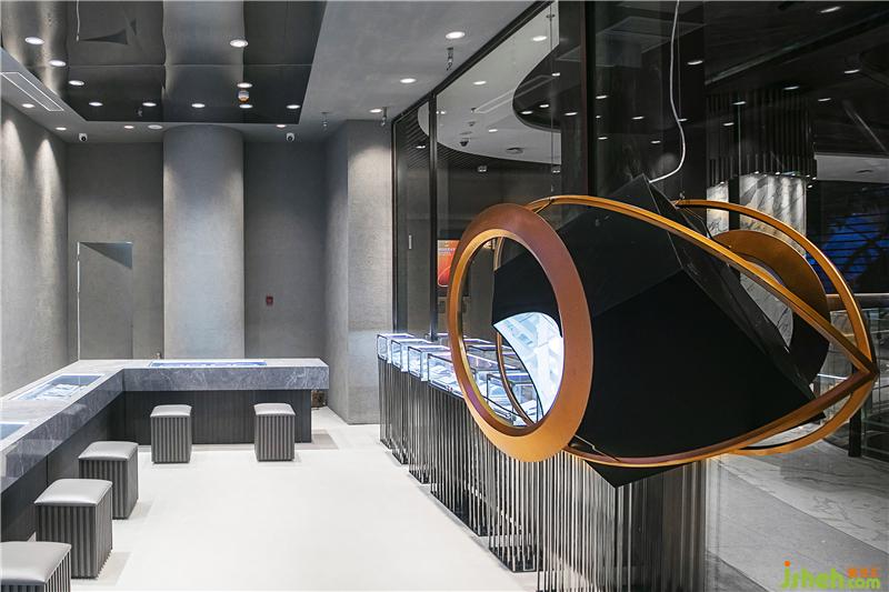 墻面和銷售展柜桌面都采用深灰色石材飾面,展示柜采用定制金屬,營造粗粒又不失精致感的空間調性,與產品相呼應。