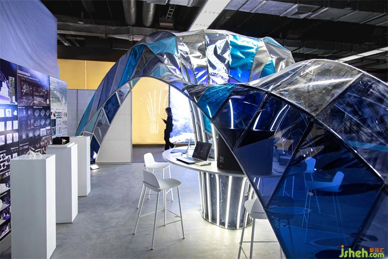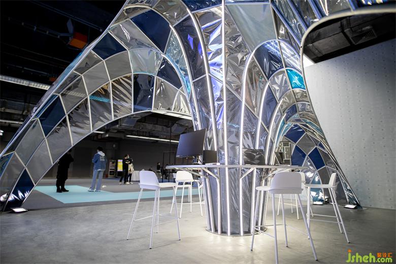 “超級設(shè)計創(chuàng)作營”作為戴爾在廣州設(shè)計周的主要產(chǎn)品展示中心設(shè)計,是承擔設(shè)計周期間戴爾的產(chǎn)品發(fā)布、文化沙龍等公共功能的展亭,我們希望顛覆傳統(tǒng)展廳的白盒子空間,打通空間的界限,創(chuàng)造一個流動與自由的空間。展廳的靈感來源于古老的拱形結(jié)構(gòu),使之經(jīng)過拉伸變換與組合,最終生成了漂浮的曲面拱結(jié)構(gòu)的形態(tài)。我們將歷史的建筑結(jié)構(gòu)元素通過一種當代的、科技與藝術(shù)相融合的設(shè)計手法來重新定義結(jié)構(gòu)形態(tài)的可能性,希望引發(fā)人們重新思考“科技與歷史”連接的可能性。