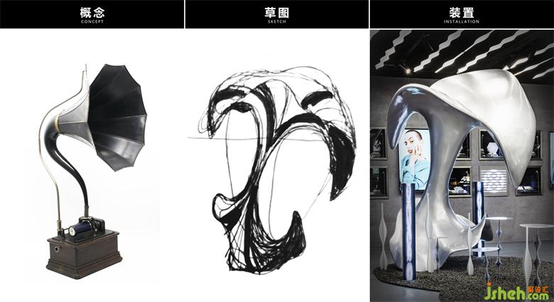 我們在經(jīng)典的喇叭形象基礎(chǔ)上進行扭曲重構(gòu),形成一個柔軟的巨大“留聲機”,仿佛變形融化的外觀完美融入這光怪陸離的夢境中。裝置造型采用3D打印工藝,反光的金屬漆表面帶來一些疏離感,巨大的體積更是將意象夸張化,成為一個記錄者,默默履行自己的職責(zé)。