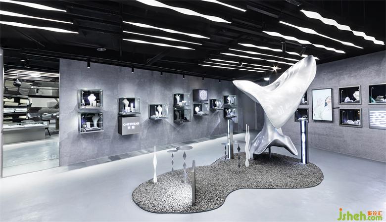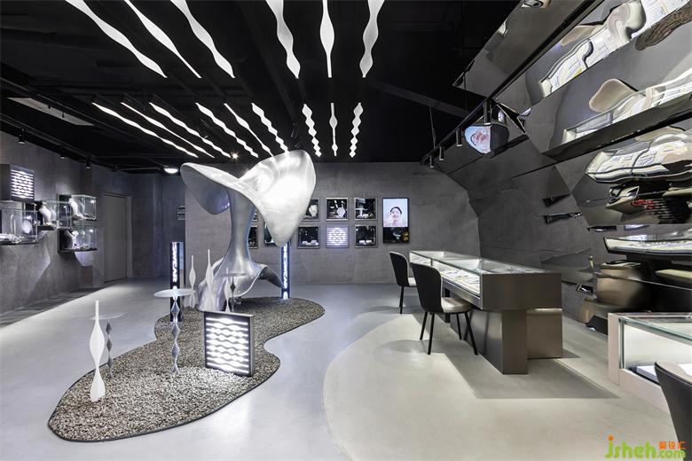 Visiting the exhibition area from the entrance all the way, display cabinetsare scattered on the wall and regular in the wall. They are like some square lenses displaying bright and beautiful jewelry.