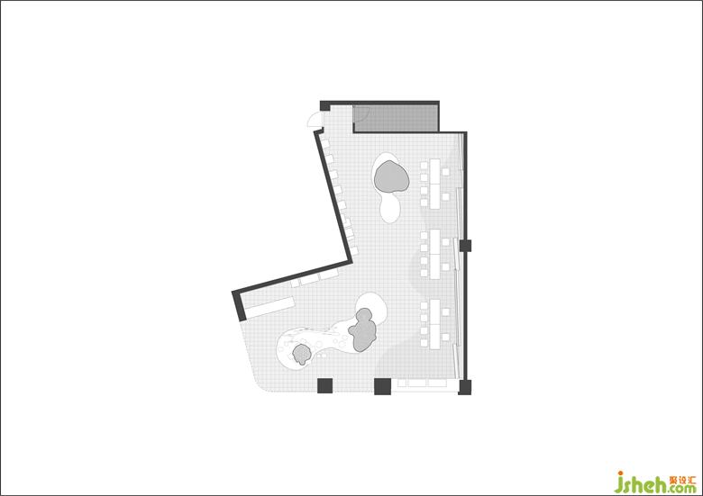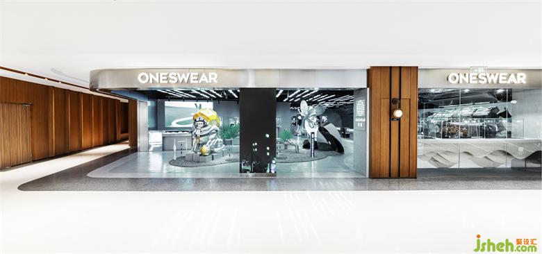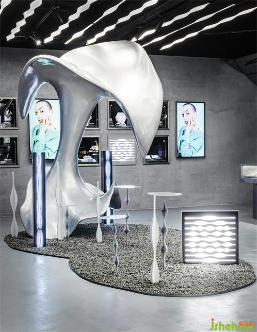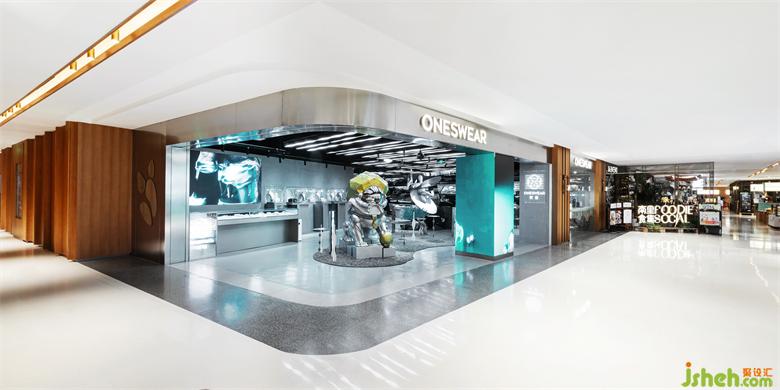 場地位于新天地商場二樓,一個扶梯上來最先看到的位置,整體呈L形。長立面直接對著走廊和扶梯,是最優(yōu)展示面,順利成章的設(shè)置為櫥窗和主入口;入口處中間的立柱包裹上環(huán)形LED屏幕,弱化了立柱對入口的隔斷,使多彩的動態(tài)廣告圖像成為視覺中心。短立面外是通往商場后勤方向的交通空間,設(shè)計上減少了展示功能,除了圍合接待區(qū)的墻面之外,其他立面區(qū)域開放與主入口相連,擴大了入口,引入顧客的視線和動線,更好的展示內(nèi)部空間和藝術(shù)裝置。店內(nèi)以藝術(shù)裝置為中心,周圍環(huán)繞著展柜和接待臺等功能區(qū),將品牌的先鋒氣質(zhì)和旗艦店的藝術(shù)主題凸顯出來。