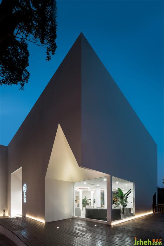 為了與原有建筑的坡屋頂形式有所呼應(yīng),并延續(xù)品牌一貫的坡頂白墻的設(shè)計元素。設(shè)計師用純凈的白色方盒子外殼將原有的建筑包裹在內(nèi)部,立面以坡屋頂形式的窗洞向內(nèi)延伸,將原有建筑與外部方盒子相連接。