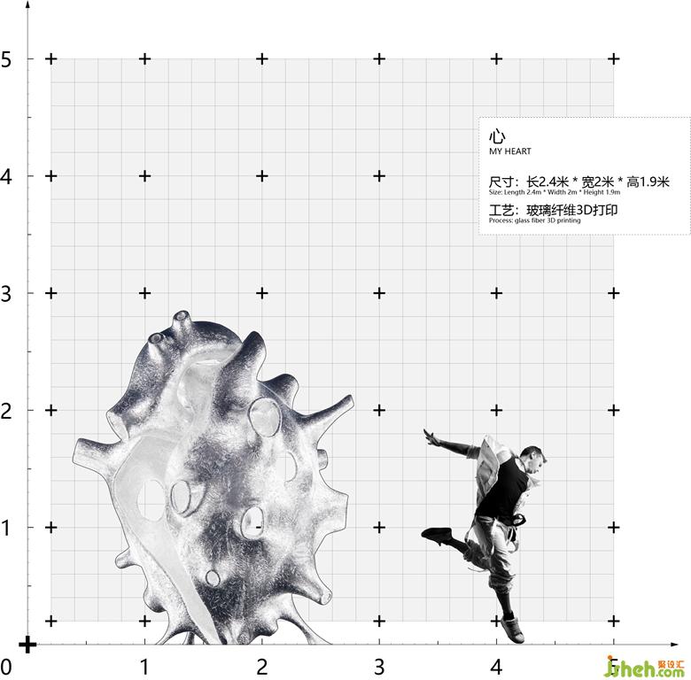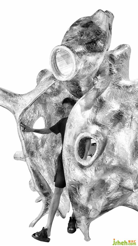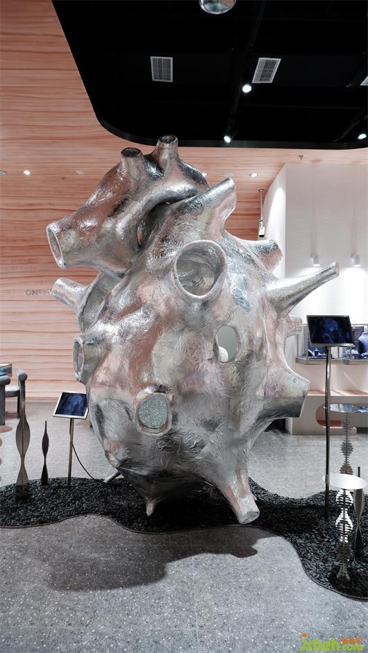 裝置整體采用玻璃纖維3D打印工藝,使用鋁箔紙在表面做出褶皺的肌理,既是對心臟纖維的意象表達,也營造出時尚先鋒的金屬質(zhì)感,打造藝術(shù)外形的同時又體現(xiàn)著理性與克制的美感。