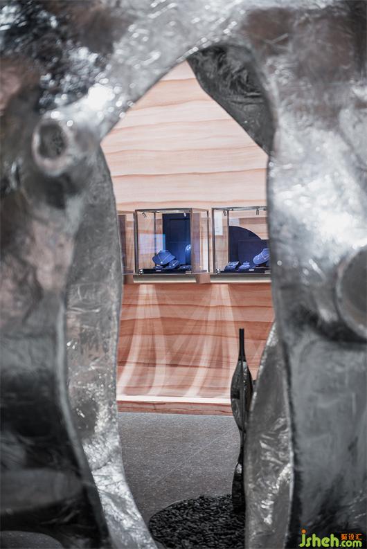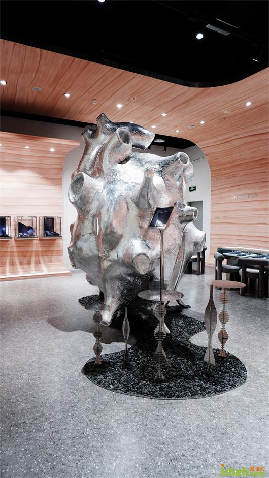 裝置以跳動的心臟為主題,位于門店中央最顯眼的位置,聚集燈光和視線,強烈的存在感提醒著人們審視自己的重要性。珠寶店設計師并沒有刻意模仿真實的心臟造型,而是將其進行藝術(shù)化處理,將極小曲面理論運用到裝置上。